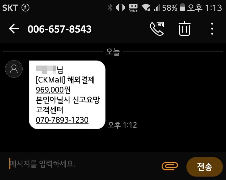 "○○○님 [CKMall] 해외결제 969,000원 본인아닐시 신고요망 고객센터 070-7893-1230"