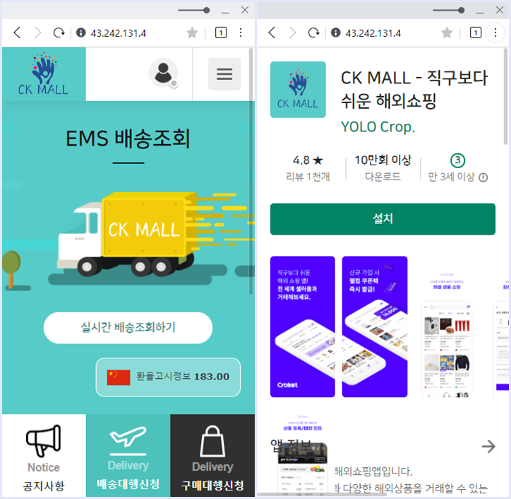URL에 접속 하면 아래와 같이 CK Mall에서 보낸것 처럼 허위로 사이트를 만들어두고 배송조회를 클릭하면 APK를 다운로드(ck1018.apk) 받는 식으로 진행이 되네요.