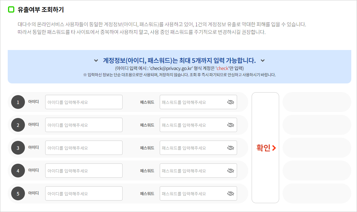 아래의 이미지들처럼 사용자 인증받고, 유출 여부를 확인할 아이디와 패스워드를 입력하면 됩니다.