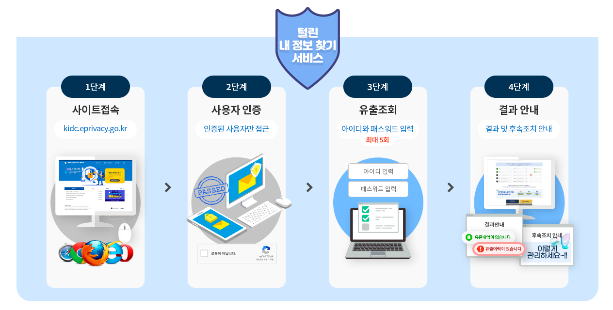 그래서 "개인정보보호위원회"와 "한국인터넷진흥원이" 자체적으로 확보한 다크 웹에서 불법 유통하고 있는 계정들을 수집하여 유출 여부를 확인할 수 있도록 하는 "털린 내 정보 찾기 서비스"를 시작했습니다.