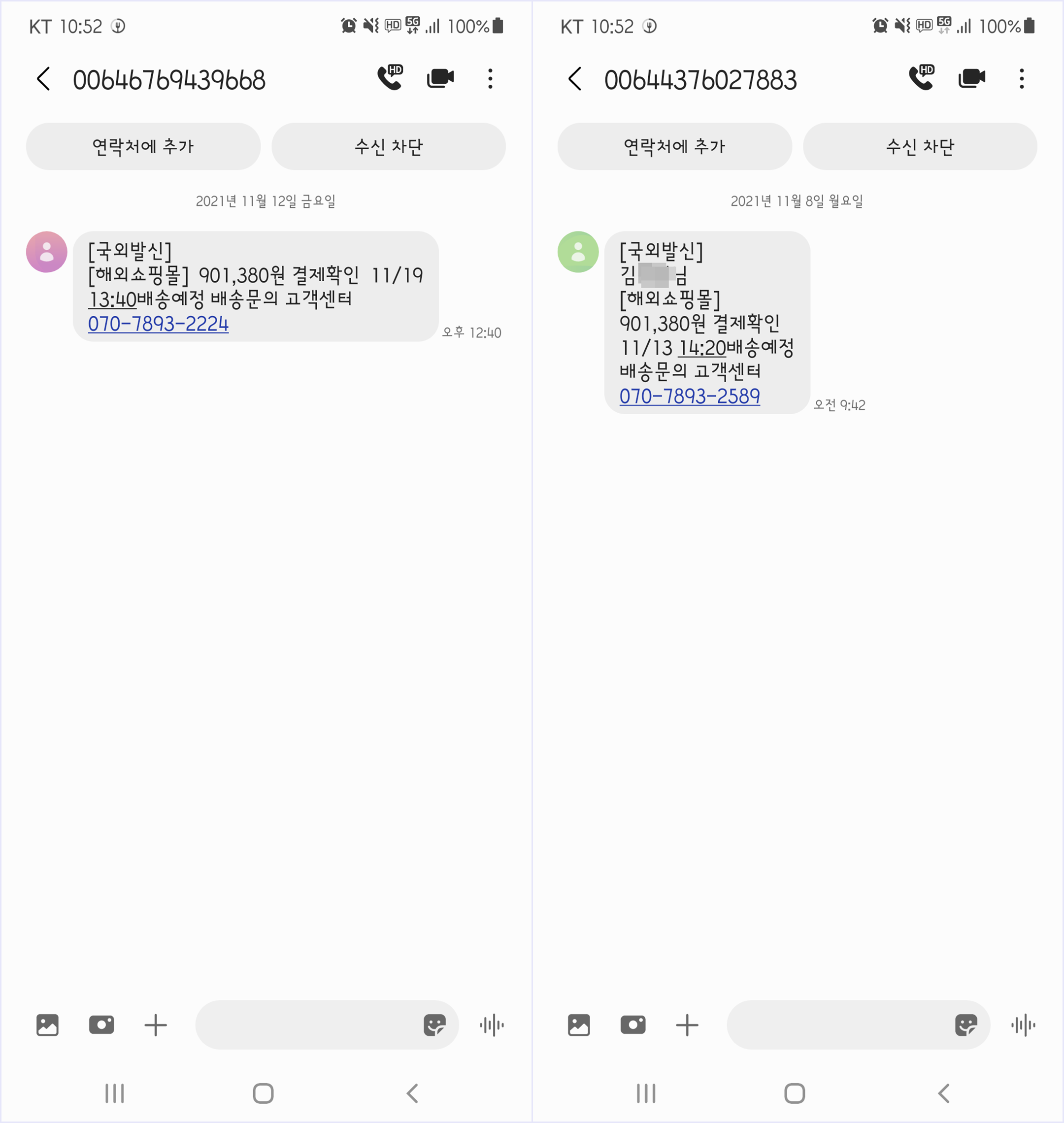 "[국외발신] [해외쇼핑몰] 901,380원 결제확인 11/19 13:40배송예정 배송문의 고객센터 070-7893-2224"